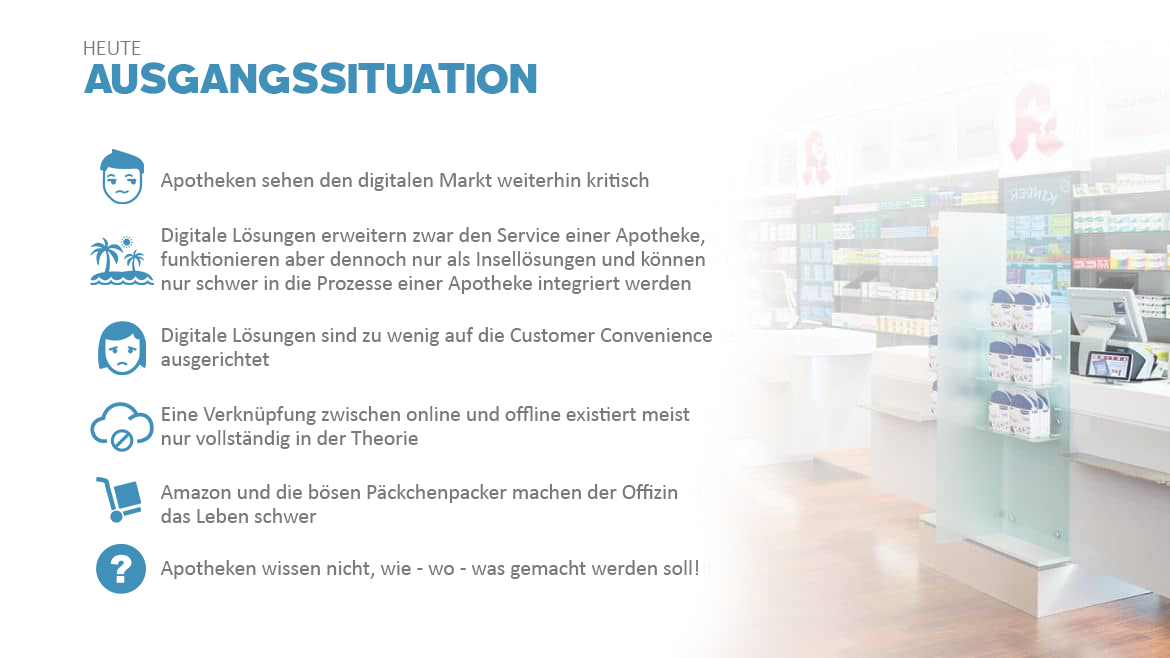 Insellösungen sind von gestern. Daher haben wir das Thema Click & Collect zum Überthema schlecht hin gemacht. Und das bedeutet, dass wir eine Lösung entwickelt haben, die in Ihre Prozesse in der Offizin, vollständig integriert ist. Dafür haben wir Anbindungen in mehreren Bereichen geschaffen, die die "Onlinebestellung" direkt in Ihr Kassensystem führt. Lassen Sie sich beraten und wir zeigen Ihnen die intelligenten Lösungen für Ihre Apotheke.