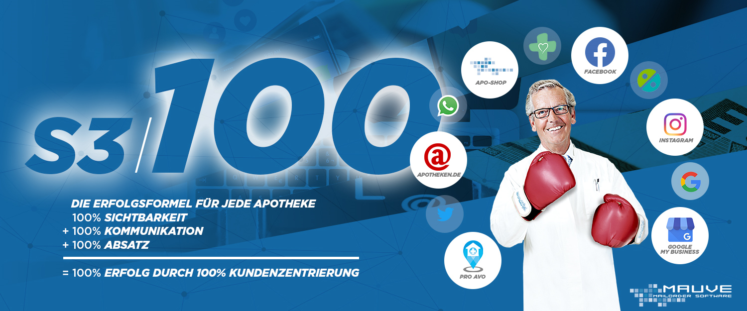 Mauve S3/100 bündelt alle aktuellen und relevanten Kommunikations-, Bestell- und Absatzkanäle. Mauve S3/100 fungiert dabei als zentrale Informations- und Schaltstelle, mit der Apotheker die unterschiedlichen Social Media- und Messenger-Dienste, Apotheken-Portale und –Shops, Preissuchmaschinen und Apps nutzen und verwalten können. Über eine übersichtliche, intuitiv zu bedienende Oberfläche können Sie Informationen auf den unterschiedlichen Kanälen posten und auswerten, Angebote präsentieren und Aufträge entgegennehmen und an Ihr Kassensystem übergeben.