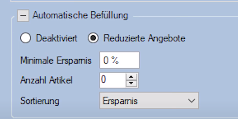 Die automatische Befüllung wird unter Artikel/Warengruppenzuordnung angestoßen. Die verschiedenen Warengruppen sind in der Artikelsortierung aufgelistet. Man kann neue Warengruppen hinzufügen oder vorhandene Warengruppen bearbeiten. Durch einen Doppelklick auf die Warengruppe kann die Funktion der automatischen Befüllung aktiviert werden, indem man auf reduzierte Angebote klickt. Jetzt hat der Apotheker verschiedene Auswahlmöglichkeiten: minimale Ersparnis, Anzahl und Sortierung. Die minimale Ersparnis errechnet sich automatisch aus der Differenz der unverbindlichen Preisempfehlung und dem Verkaufspreis. Die Anzahl der Artikel legt fest, wie viele Artikel der Warengruppe zugeordnet werden. Bei der Sortierung kann man auswählen zwischen der Ersparnis und der Anzahl der Verkäufe. Wenn Ersparnis gewählt wird, werden die Artikel mit der größten Ersparnis als erstes angezeigt. Wenn Anzahl Verkäufe gewählt wurde, werden die mit den höchsten Verkaufszahlen angezeigt. Wenn die Einstellung getroffen wurde, wird die Warengruppe automatisch über Nacht aufgefüllt. Welche Preisgruppen für die Berechnung der Ersparnis verwendet werden, kann in den Shop Einstellungen festgelegt werden. Dabei ist Preisgruppe 1 der Endverbraucherpreis (EVP) und Preisgruppe 2 die unverbindliche Preisempfehlung (UVP).