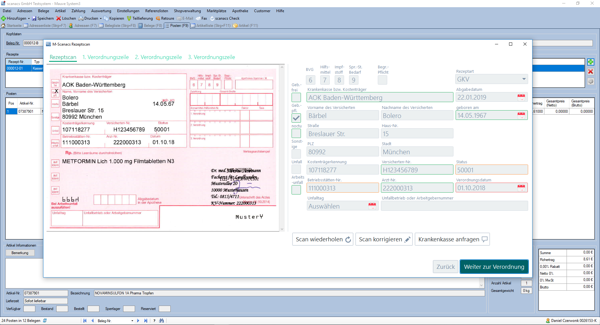 Über ein von Mauve entwickeltes Front-End für die Anwendung hat der Apotheker ohne Medien- bzw. Applikationsbruch die Möglichkeit, die vertraute Oberfläche des Mauve System3 für die Durchführung der Verordnungs- und Zuzahlungsprüfung zu benutzen. Nach dem Einscannen des Rezepts erfolgt automatisch der Datenaustausch mit scanacs zwecks Verordnungsprüfung. Dabei werden dem Apotheker über das Mauve System3 alle notwendigen Informationen im Rahmen der Verordnungs- und Zuzahlungsprüfung zur Verfügung gestellt und Austauschartikel gemäß Rabattvertrag der jeweiligen Krankenkasse angezeigt.