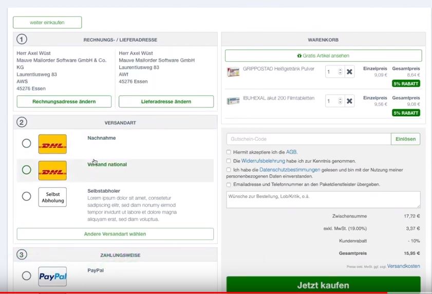 Beim Mauve SinglePageCheckout stehen Einfachheit und Benutzerfreundlichkeit im Vordergrund. Sämtliche für den Bestellprozess relevanten Eingaben und Änderungen können die Kunden jetzt auf einer einzigen Seite machen. Online-Apotheken ersparen ihren Kunden eine Vielzahl von Bestellschritten. Stattdessen sind nur noch zwei Klicks bis zum Abschluss der Bestellung erforderlich.